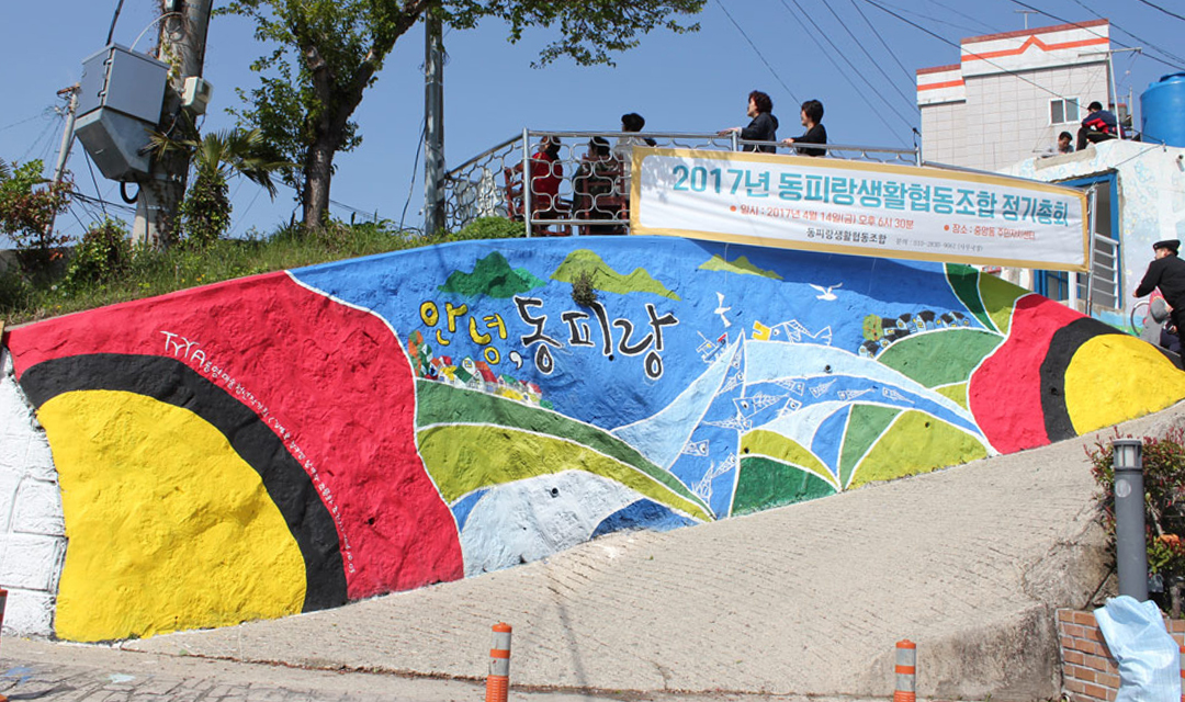 이에 푸른통영21, 행정(통영시, 행안부), 교육계(충무중학교, 인평초등학교, 통영교육청), 경상대학교 해양과학대학, 지역내 자생문화지킴이인 '드러머팀' 마을주민자치위원회가 한자리에 모여 머리를 맞대고 함께 만들어낸 협력과 소통의 장으로 동피랑 사업을 추진하게 된다. 문화와 삶이 어우러지는 마을 만들기를 통해 예향 통영을 체감할 수 있는 장소로 가꾸어 공공미술을 통한 통영의 명물로 만들고자 그림이 있는 골목, 역사와 문화가 살아있는 골목으로 커뮤니티 디자인(Community Design) 개념을 추가하여 벽화 뿐 아니라 천천히 걸어다니면서 느끼는 볼거리와 휴식을 추구하는 슬로우 시티(Slow City), 슬로우 라이프(Slow Life)를 지향하는 통영의 또 하나의 명물로 재구성된 곳이다.